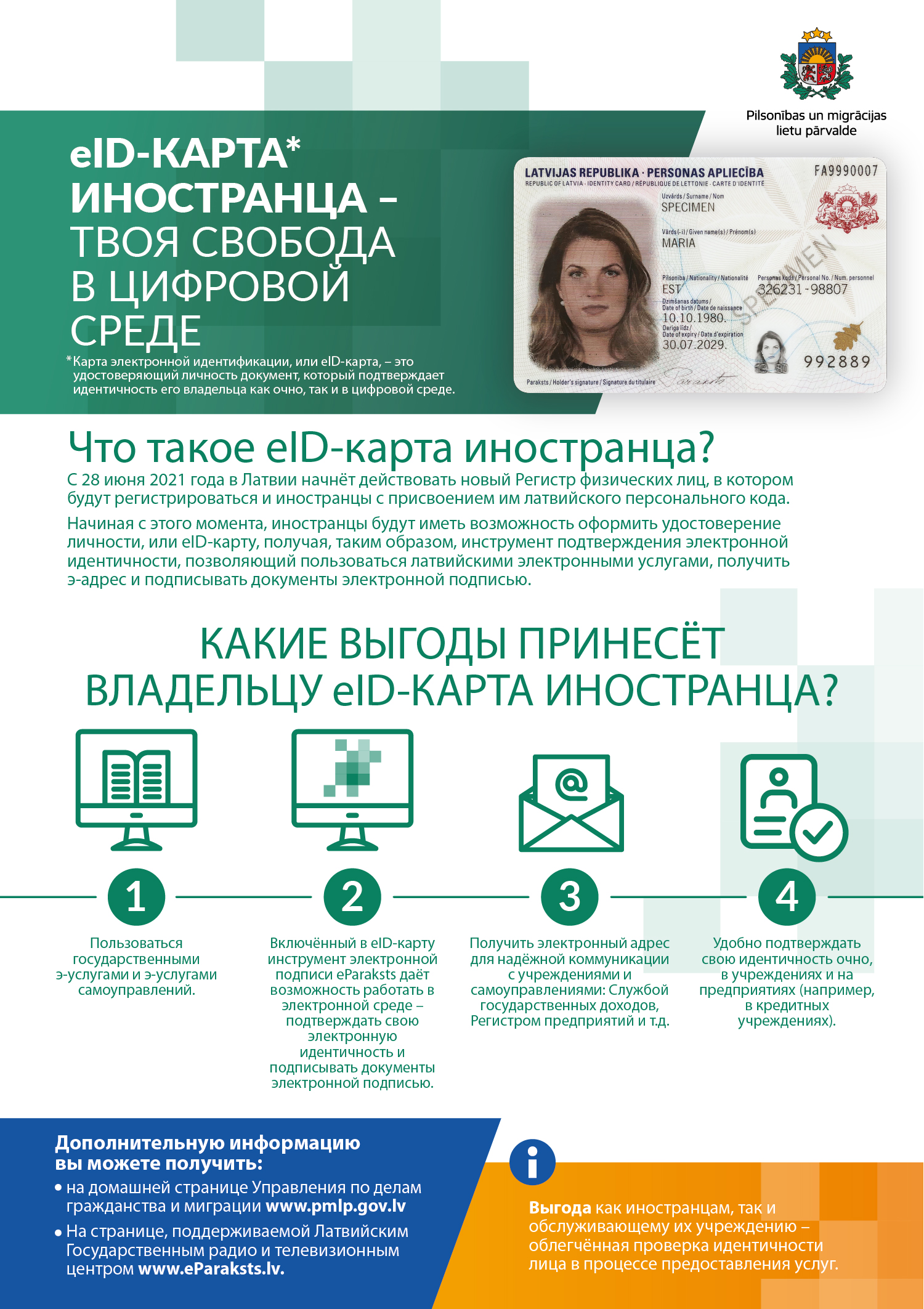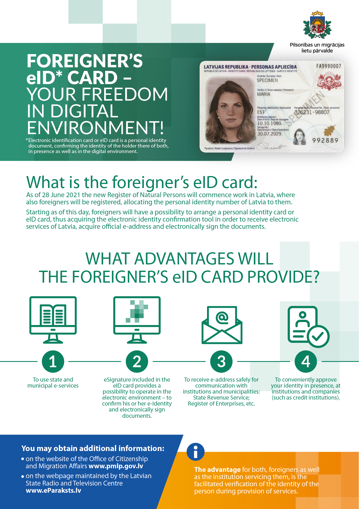 The alien's electronic identification means - the alien's eID card will provide the foreigner with the possibility to function fully in the electronic environment: use national e-services, use an e-address to ensure communication with public authorities, to identify electronically and to sign documents, so that a wide range of services provided by the State is used in general. It will allow you to easily and quickly confirm your identity in the institutions and businesses in Latvia.