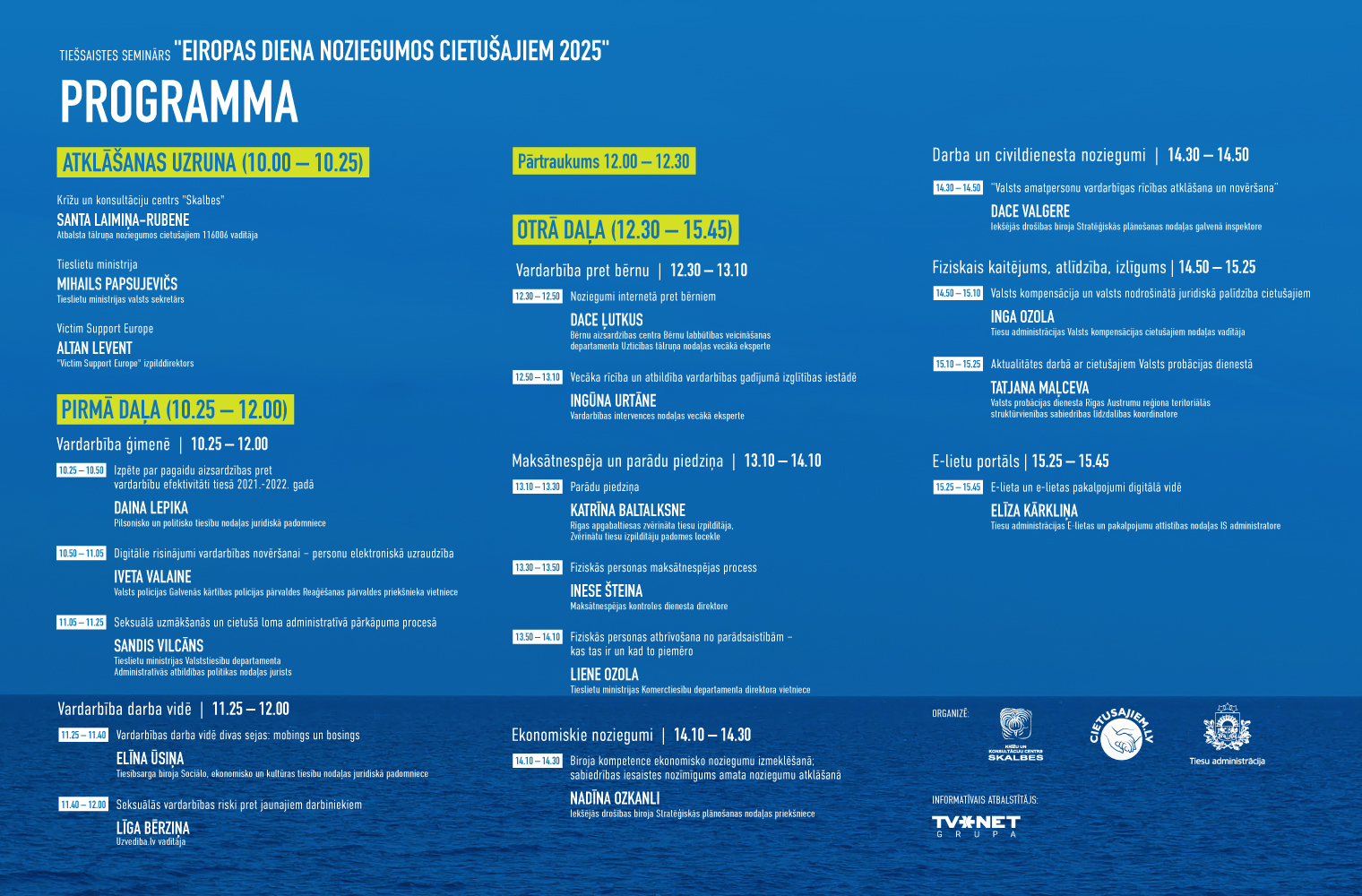 Semināru pārstāves lektori no Tieslietu ministrijas, Valsts policijas, Latvijas Republikas Tiesībsarga biroja, portāla Uzvediba.lv, Bērnu aizsardzības centra, Latvijas Zvērinātu tiesu izpildītāju padomes, Maksātnespējas kontroles dienesta, Iekšējās drošības biroja, Tiesu administrācijas un Valsts probācijas dienesta.